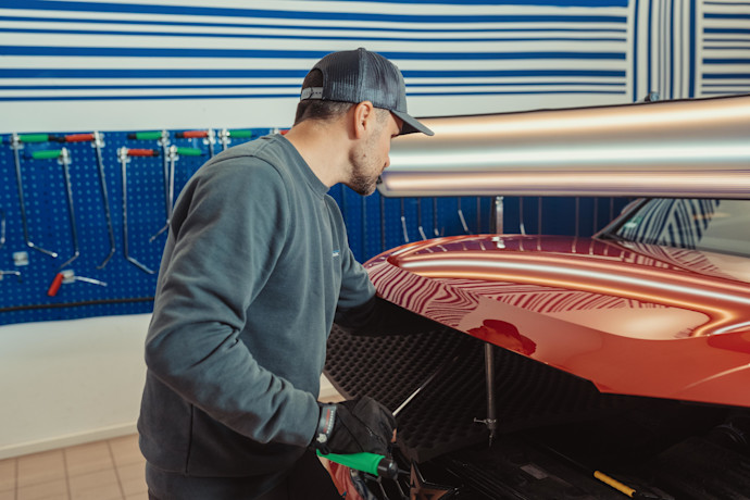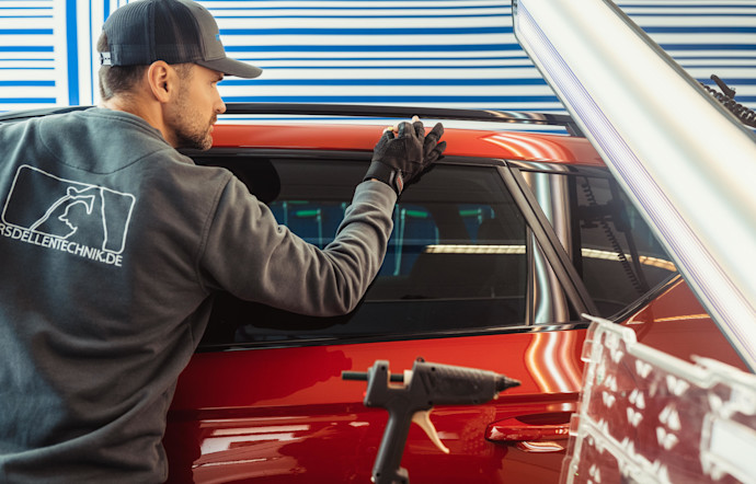 Wir arbeiten mit Mechanik statt mit Chemie. Mit speziellen Werkzeugen und viel Sorgfalt drücken wir Stück für Stück jede Delle nach außen – bis Ihr Auto wieder eine perfekt glatte Oberfläche hat.