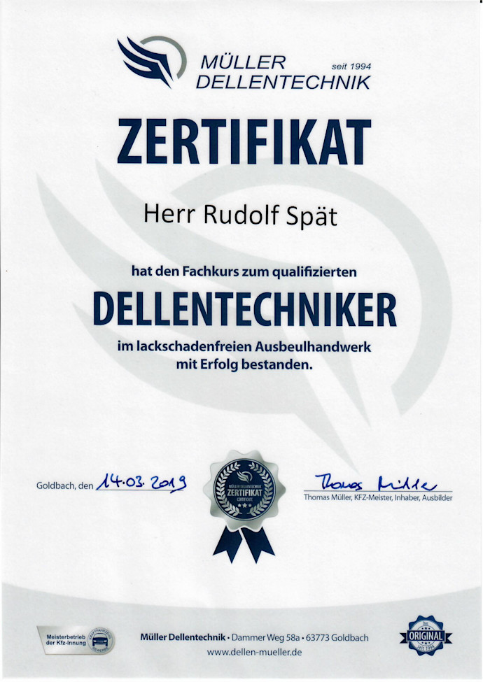 Dieses Zertifikat bestätigt, dass Rudolf Spät nach dem DEKRA Standard geprüft wurde. Geprüft werden dabei die Arbeitsqualität, Fachkenntnisse sowie die eingesetzten Arbeitsmittel und Werkzeuge. Die Gültigkeit dieses Siegels läuft bis Dezember 2029.